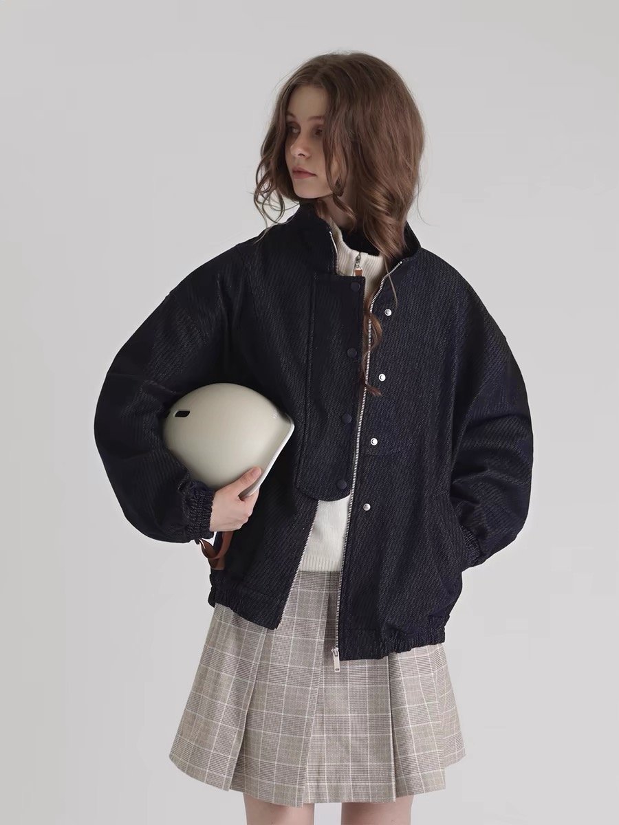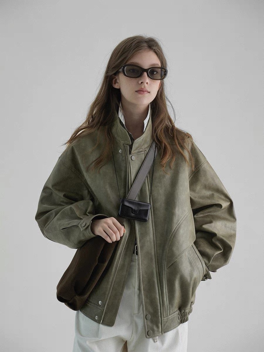 The Pilot Jacket with Stand Collar Leather Outerwear for Women combines a sleek, aviation-inspired design with a stylish stand collar, offering a modern and edgy look.